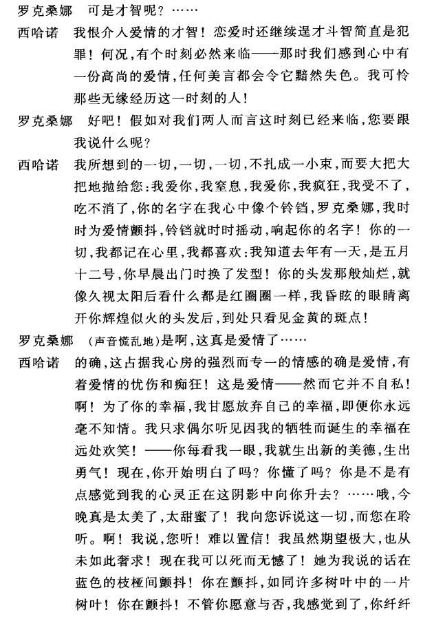 本剧是一部具有喜剧色彩的爱情悲剧,有大量华丽夸张的描写和充满想象力的对白,以下是几个经典片段:
